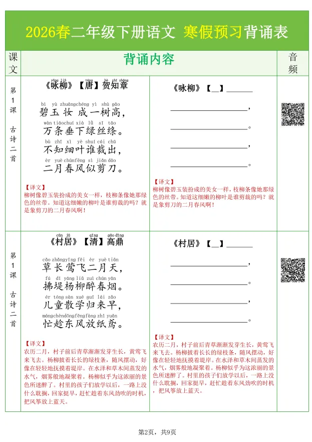 大家好,今天欣妈给大家分享的是:26春二年级下册寒假预习背诵与默写(包括课文、古诗、日积月累)共9页,电子版可下载可打印,拉至文末左下角,阅读原文处,完整电子版文章末尾可直接领取,无套路,欢迎收藏和下载。如果觉得这份资料不错,建议分享到班级群/年级群,让其他家长打印出来,帮助孩子学习;如果觉得合适,请支持正版!