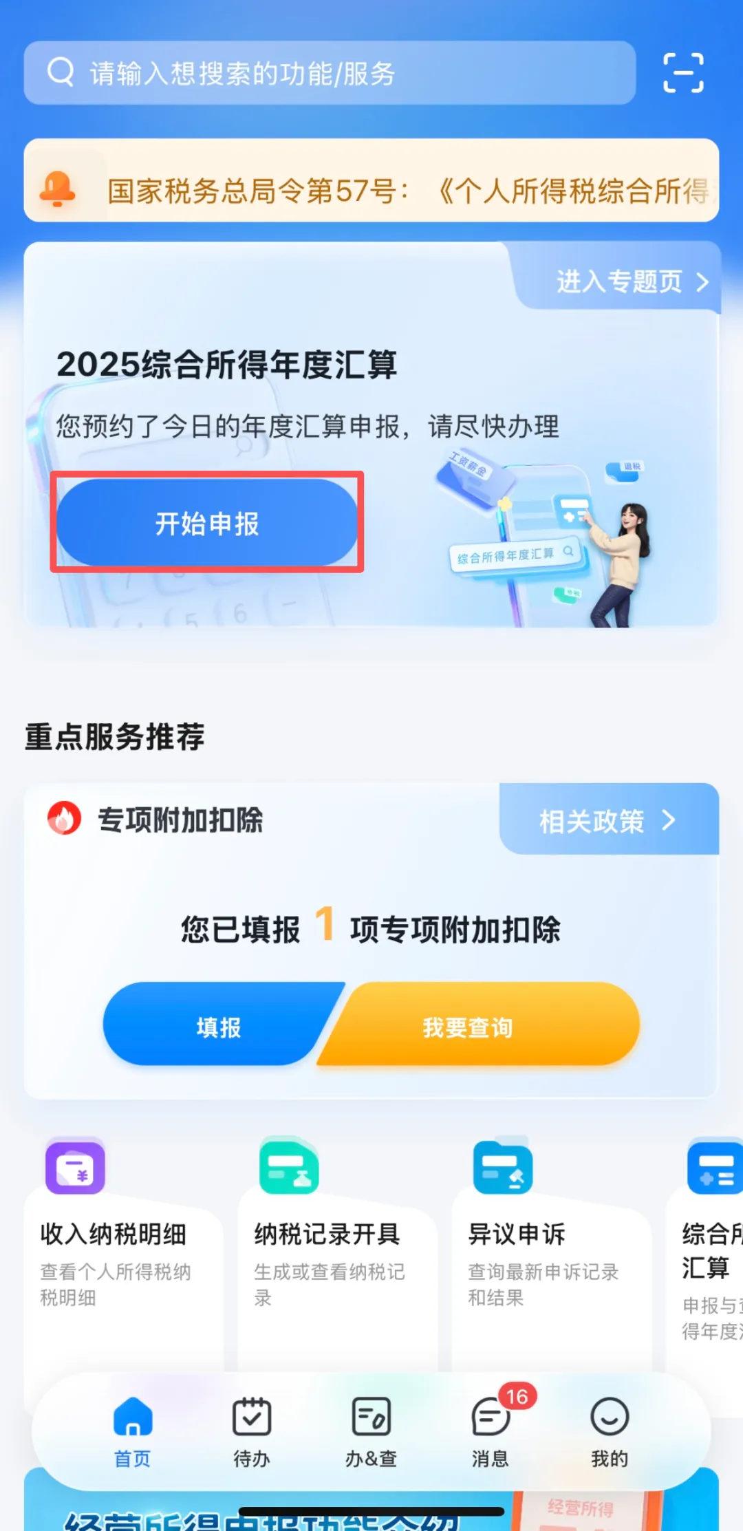 一、打开“个人所得税”APP,通过首页——“2025综合所得年度汇算”,进入申报。