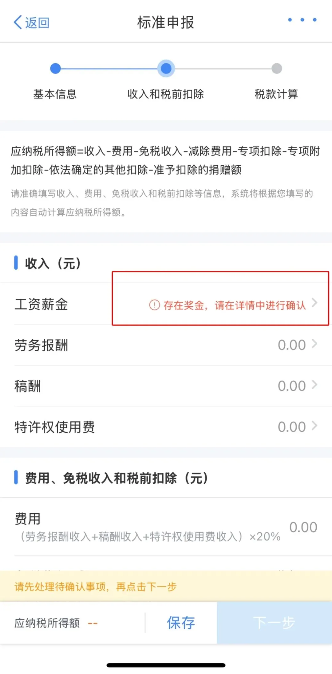 五、回到“收入和税前扣除”界面,当您对收入、费用、免税收入和税前扣除等项目核对无误后,可以点击“下一步”至税款计算界面。在税款计算页面确认应纳税额、已缴税额及应补退税金额后即可提交申报。