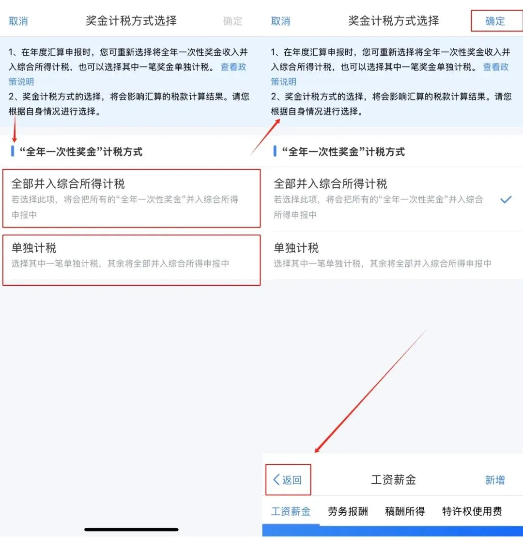 四、您可以通过【奖金计税方式选择】将“全年一次性奖金”【全部并入综合所得计税】,或者选择其中一笔【单独计税】。如下图所示,完成奖金计税方式选择后点击“返回”。