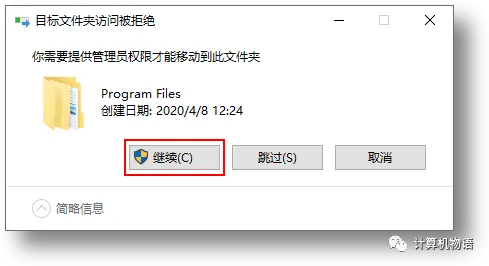 如果弹出 目标文件夹访问被拒绝,就点继续
