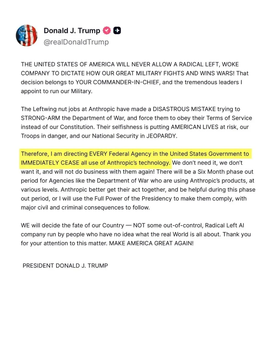 2月27日下午4点,特朗普在五角大楼截止时间约一小时前,率先在Truth Social发文,下令所有联邦机构立即停止使用Anthropic技术,同时给予六个月过渡期。