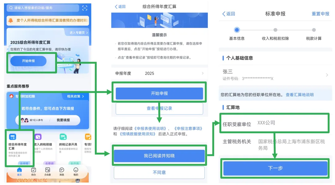 在APP右下角点击“我的”菜单,确认已经用自己的用户名登录APP后回到首页,按照下图所示即可进入2025综合所得年度汇算页面,然后点击开始申报。在阅读并同意申报须知后,在基本信息页面确认任职受雇单位后,点击下一步。
