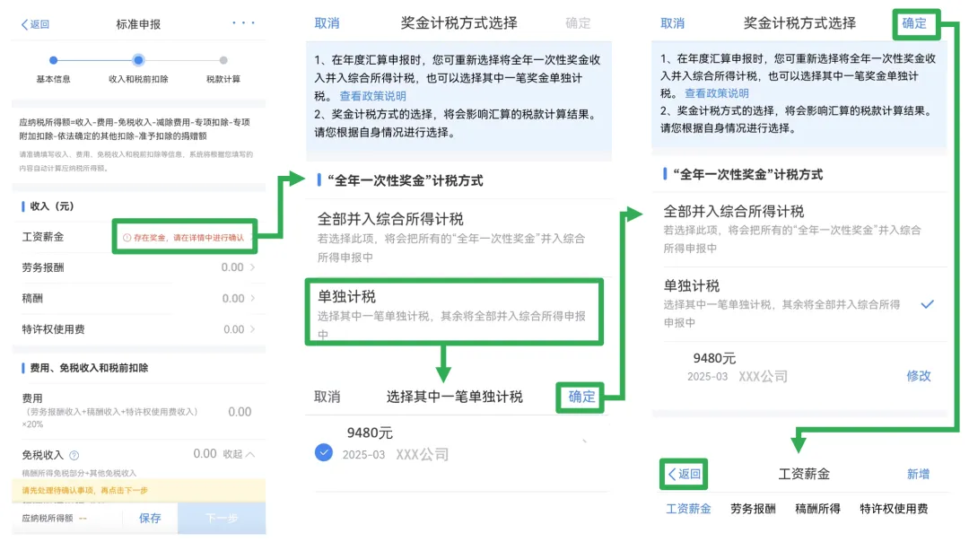 进入收入和税前扣除页面浏览各种收入和免税扣除金额信息。如果全年收入包含奖金时,可以在工资薪金处点击红色字样,进入奖金计税方式选择。如下图所示完成奖金计税方式选择后点击返回。