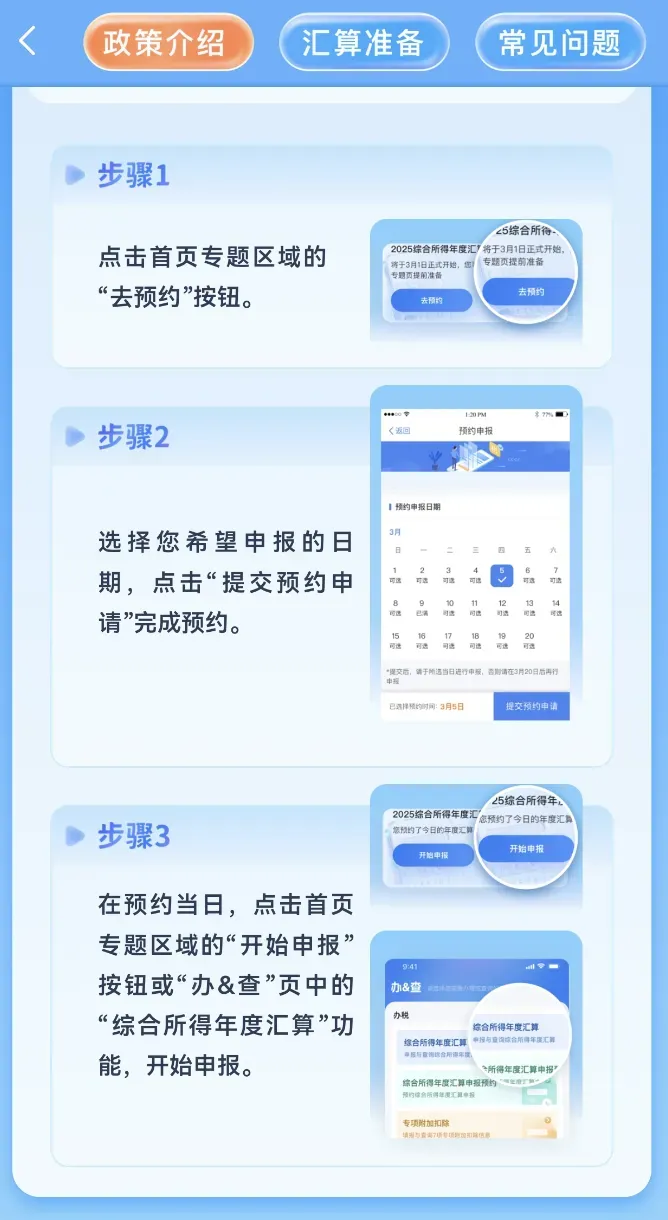 在预约当日或者3月21日之后,请参考如下指引登录个人所得税APP进行个税汇算: