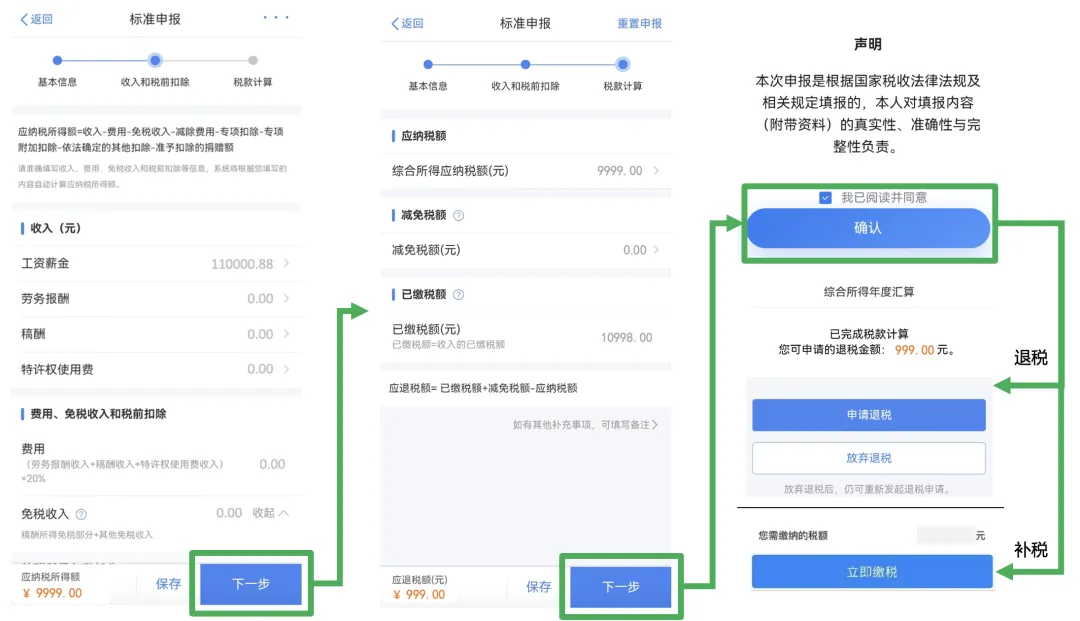 回到收入和税前扣除页面,确认无误后可以点击下一步进入到税款计算页面。在税款计算页面确认应纳税额、已缴税额及应补退税金额后即可提交申报。