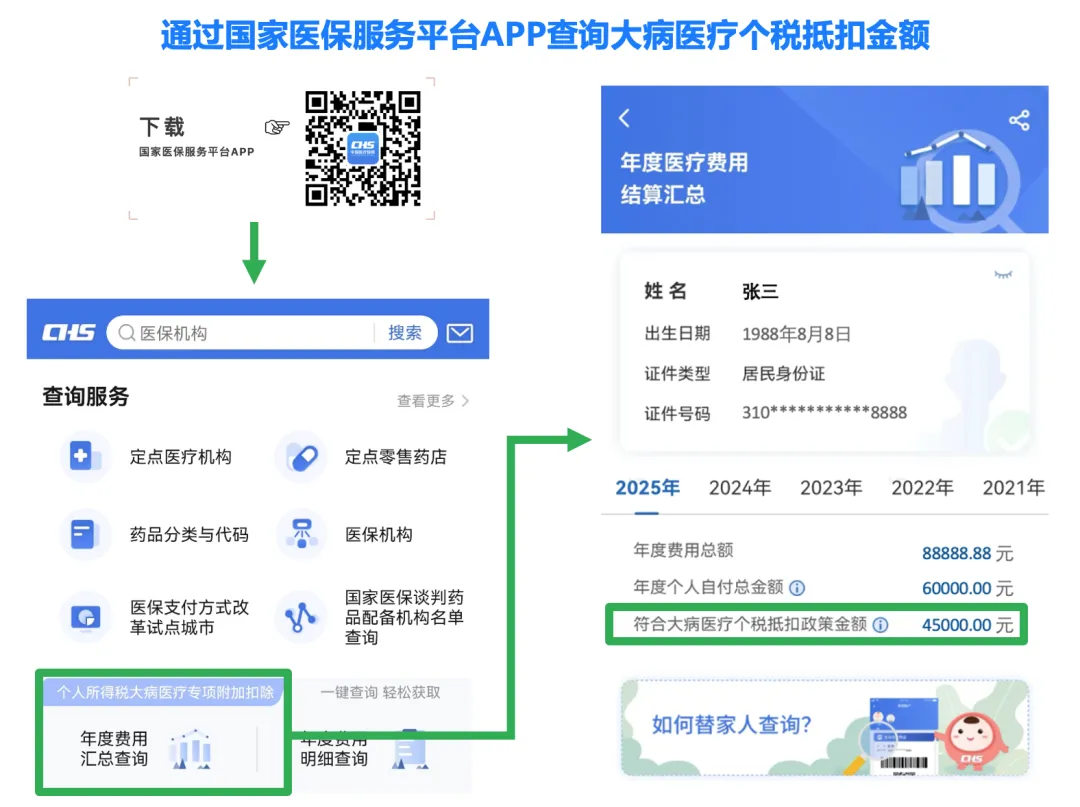 按照如下指引,在下载安装国家医保服务平台APP后,可以直接查询大病医疗年度费用结算汇总。