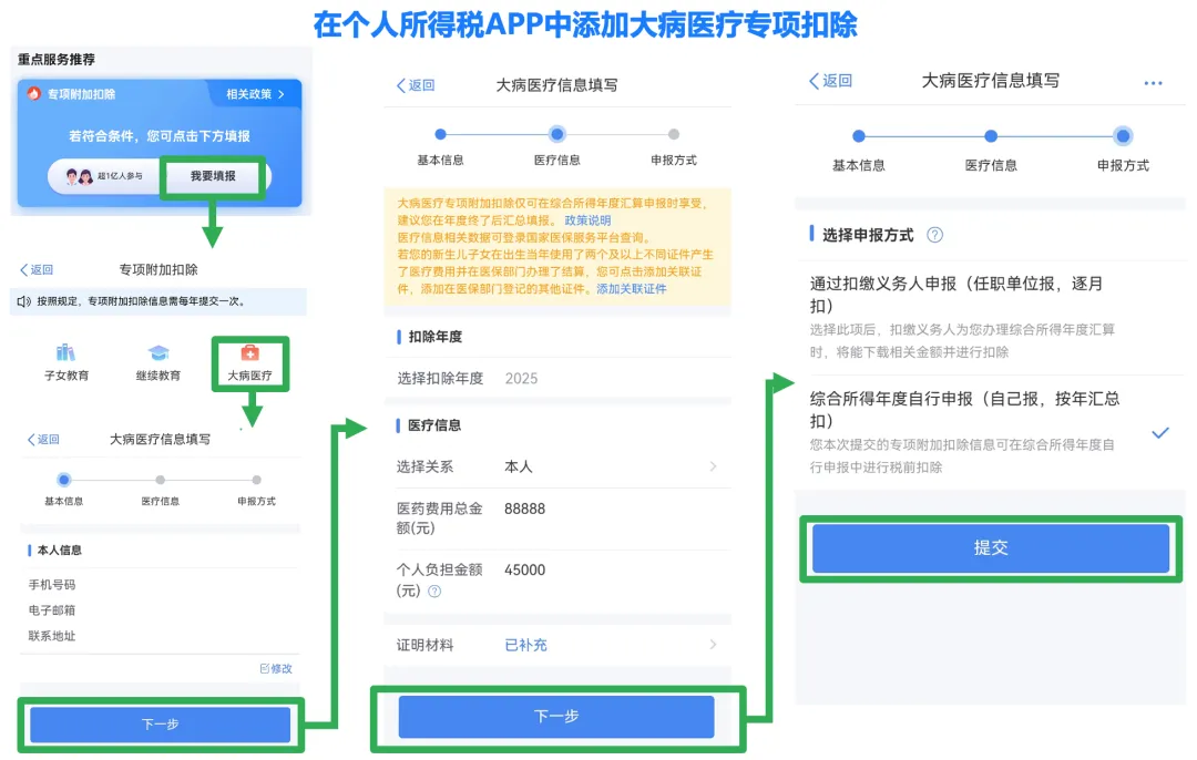 在开始年度个税汇算操作前,按照如下指引在个人所得税APP中预先添加好符合条件的大病医疗专项附加扣除信息,并选择综合所得年度自行申报即可在年度汇算申报时享受扣除。