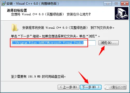 5.选择安装目录,默认安装在C:\Program Files (x86)\Microsoft Visual Studio(建议安装在除C盘以外的磁盘上,可以直接将C改为D,安装到D盘。也可在D盘新建文件夹VC6.0)然后点击“下一步”