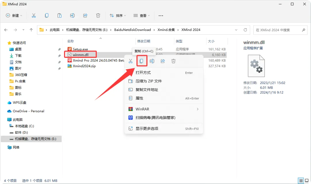 5.回到安装包解压后的【Xmind2024】文件夹,鼠标右击【winmm.dll】选择【复制】。