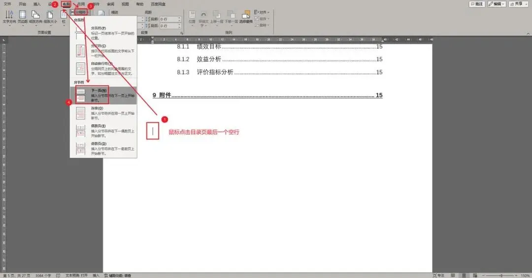 鼠标点击目录页的最后一行,在布局菜单中,选择“分隔符”,点击“下一页”。