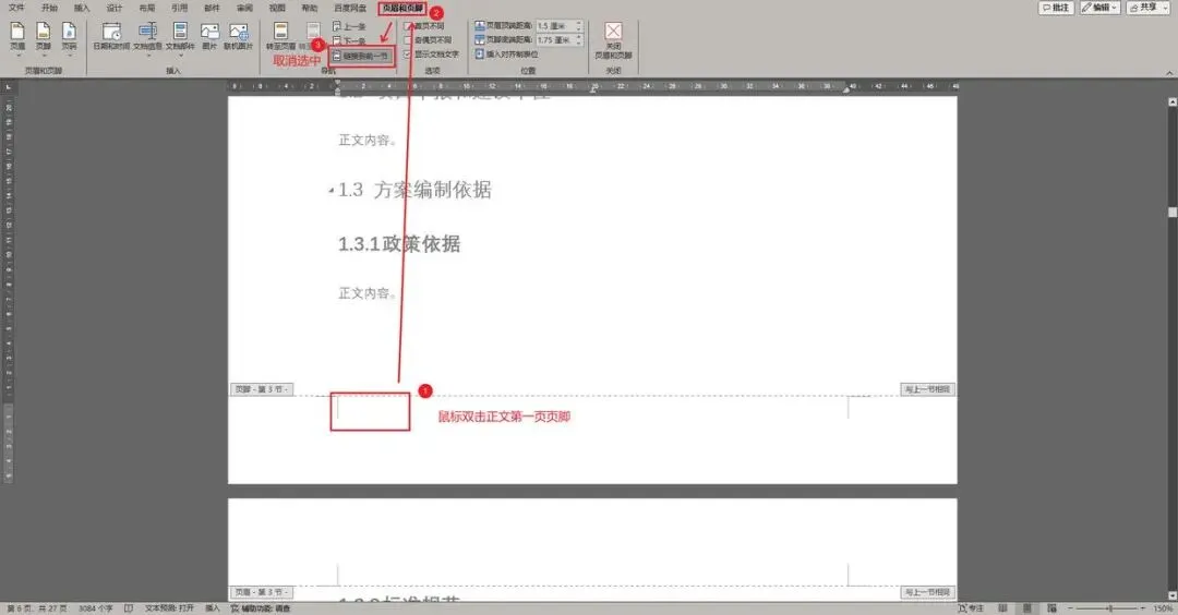 同理,将目录第一页页脚取消选中“链接到前一节”。