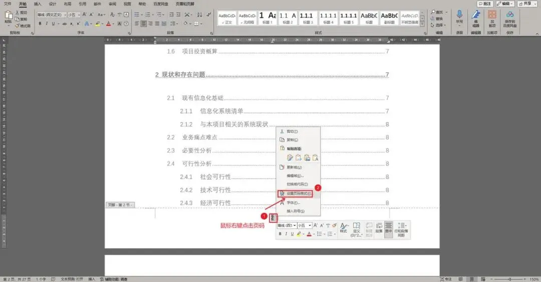 鼠标右键选择目录页第一页页码,点击“设置页码格式”。