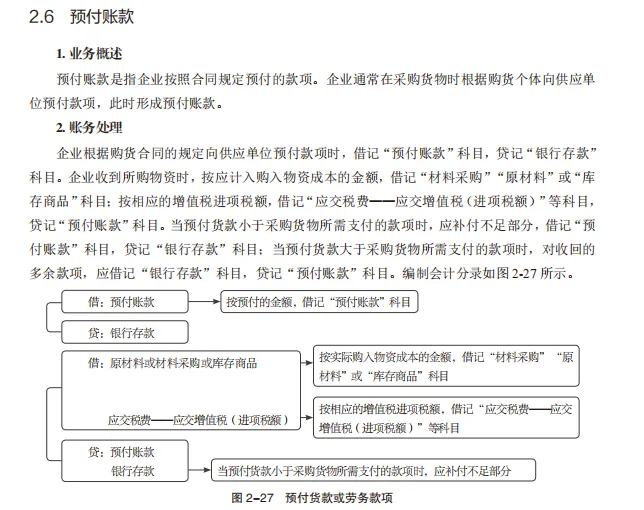 (一)企业因购货而预付的款项,借记本科目,贷记“银行存款”等科目。收到所购物资时,按应计入购入物资成本的金额,借记“材料采购”或“原材料”以及“库存商品”等科目,按应支付的金额,贷记本科目。补付的款项,借记本科目,贷记“银行存款”等科目;收到退回多付的款项做相反的会计分录。涉及增值税进项税额的,还应进行相应的处理。