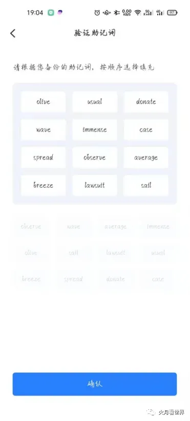 9.下一步后出现验证助记词,将抄起来的助记词开始拉入白色框