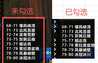 否则将看不到龙骨荒野的任务路径,如下图左多了一个72-74龙骨荒野。