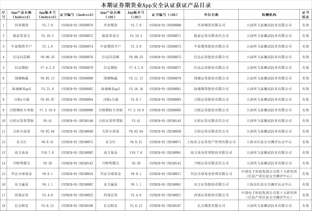 本期通过证券期货业App安全认证名单具体如下: