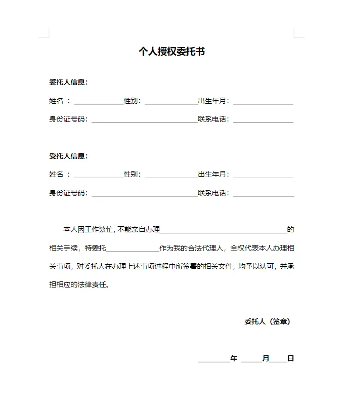 授权委托书电子模板word电子版可打印 本文分享的是 授权委托书电子模板(word电子版)可打印 所有的模板 完全免费 , 没有收费套路 下载后办公软件可直接编辑修改打印 ↓ 网盘打包 下载链接 ↓ https://pan.quark.cn/s/bfdb775d0ef0 以下是部分预览图展示 因篇幅有限 以上仅为部分预览图 全套500+套各种房屋租赁合同 手机 点击左下角 阅读原文 ,免费保存