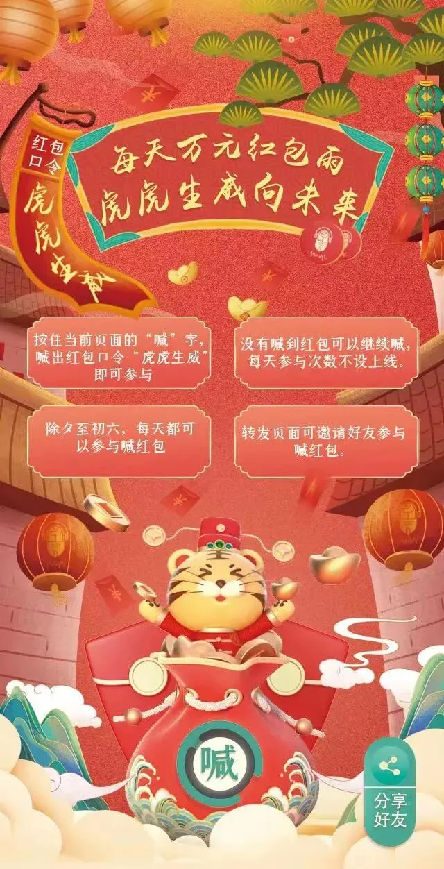 2、按住页面的“喊”字,喊出红包口令“虎虎生威”即可参与;