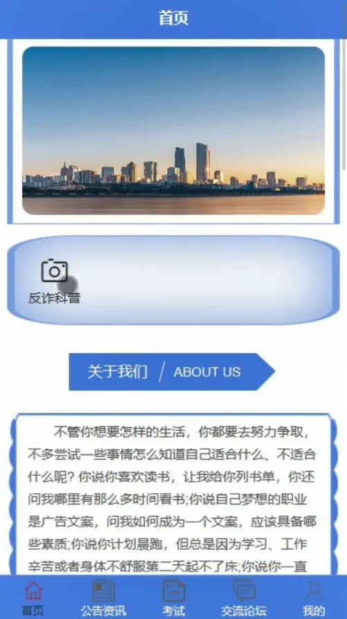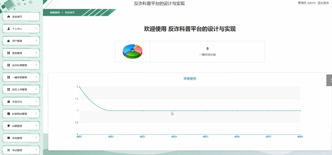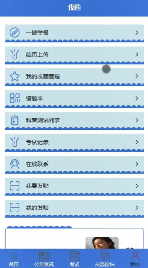 首页资讯浏览、公告查看、科普考试、交流论坛、一键举报、经历上传、在线咨询、个人收藏、错题本及考试记录。 - 管理端: