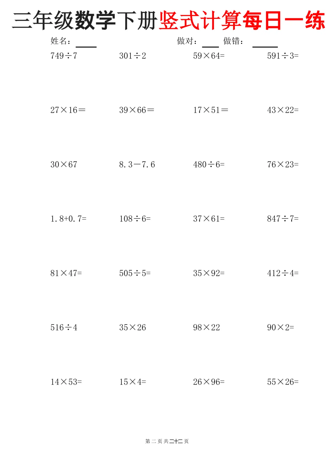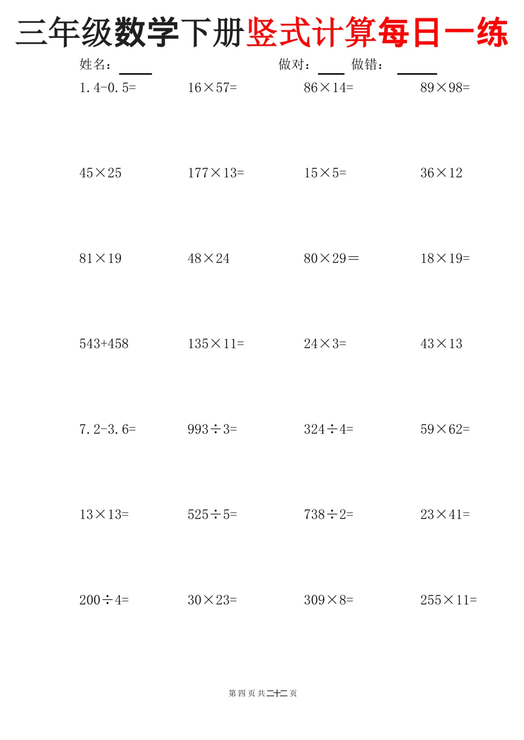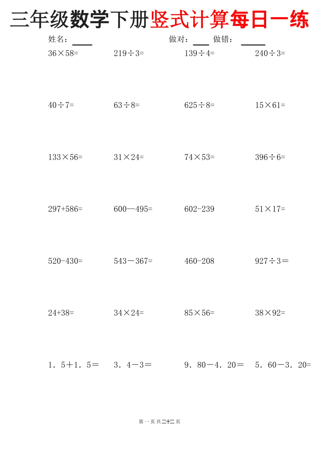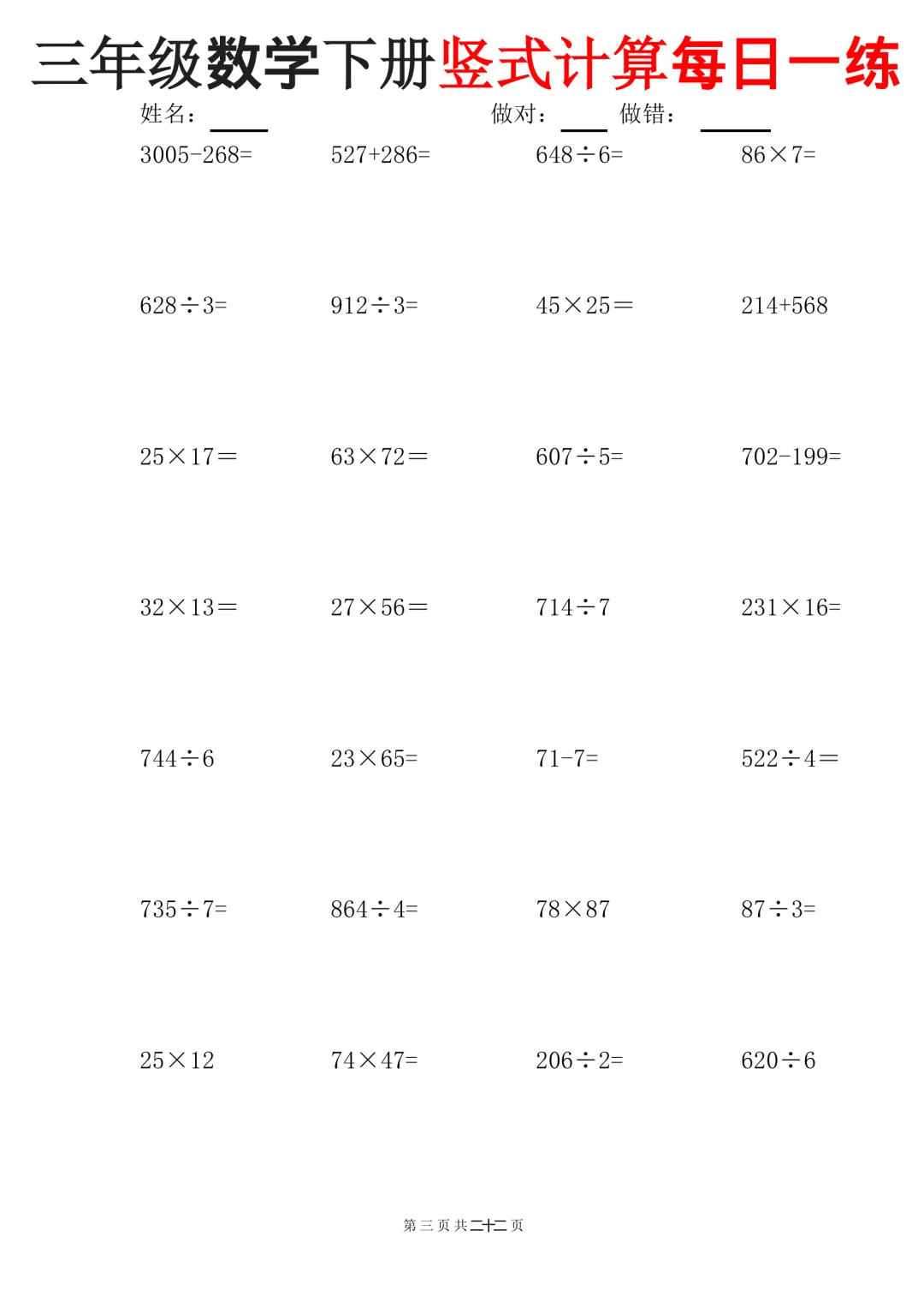 三下数学竖式计算每日一练22页(可下载打印)