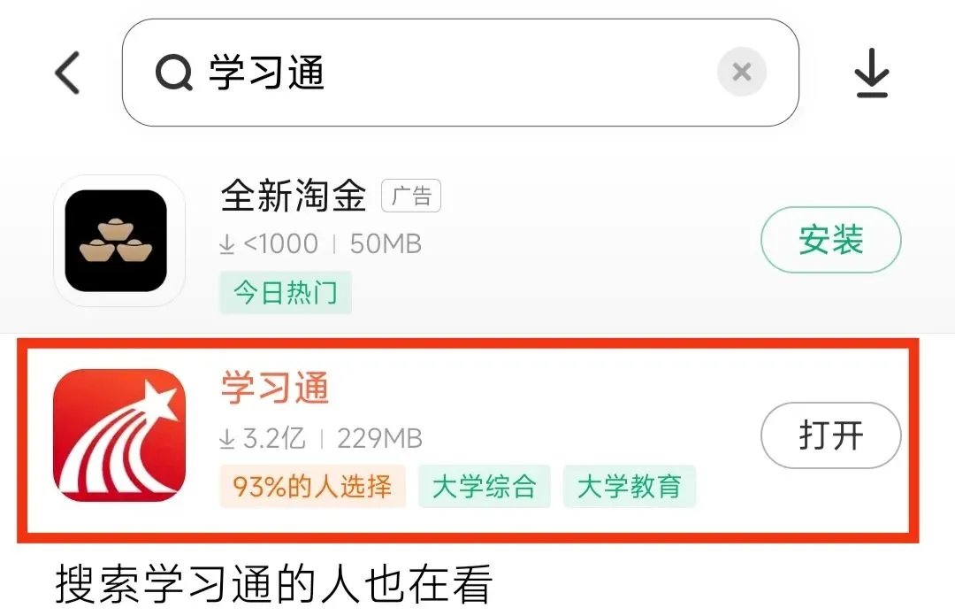 打开手机自带应用商店,搜索下载《学习通》APP,应用名称与样式如下: