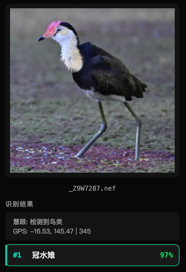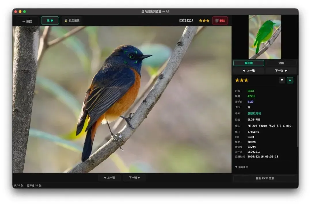 自带选鸟结果浏览器,处理完直接在里面翻片挑片,不依赖任何第三方软件。