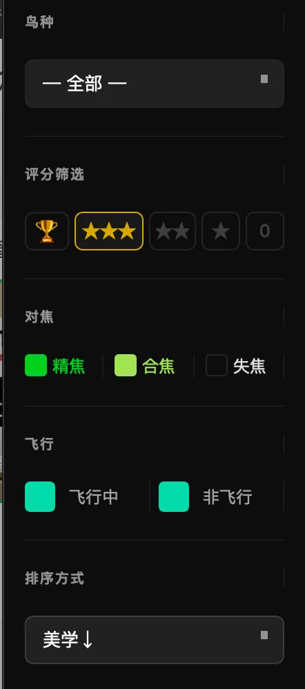 • 左侧按星级、对焦状态、飞鸟、鸟种筛选 - ●