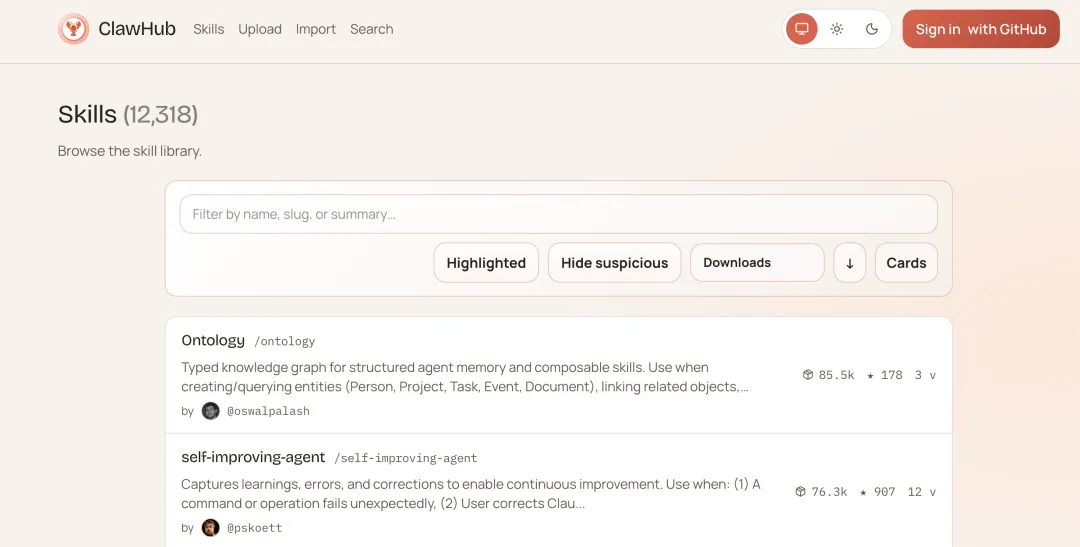 ClawHub 上用户自发上传的 skills 数量已经破万,五花八门|图片来源:ClawHub 官网