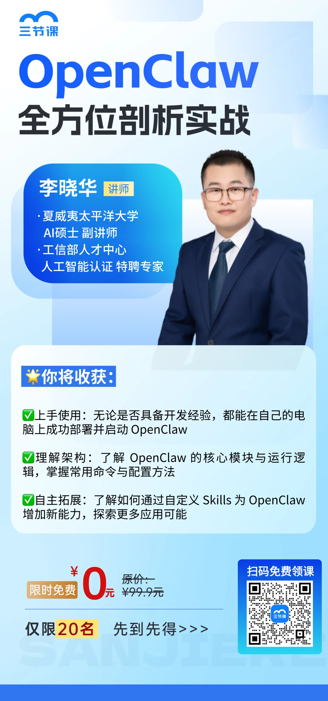 三节课最新《OpenClaw 全方位剖析实战》课,帮你打破壁垒,由夏威夷太平洋大学 AI 硕士、工信部特聘专家李晓华老师亲授,从部署启动到架构解析,再到自定义拓展,带你从 0 到 1 掌握 OpenClaw!