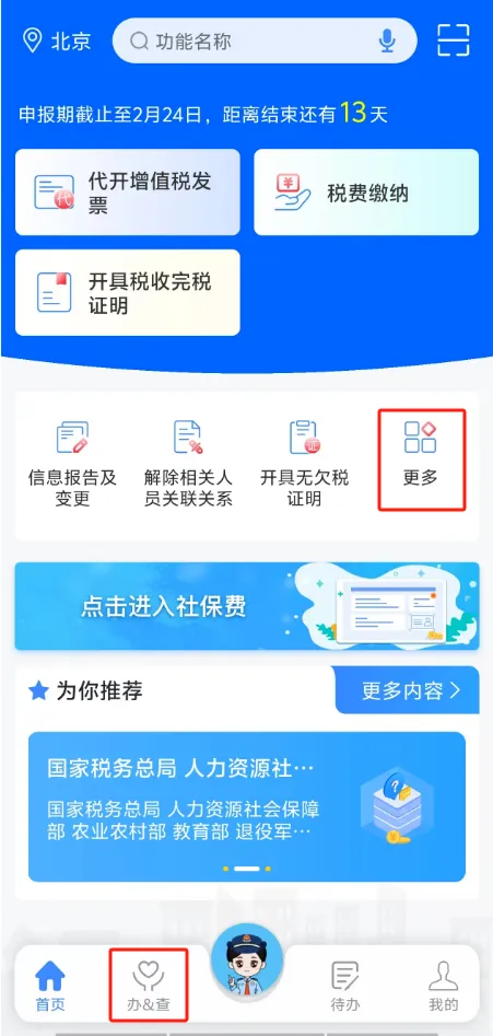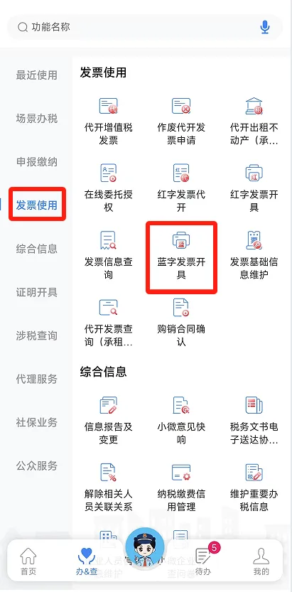 打开电子税务局App,登录后点击首页【更多】,选择【功能中心】 -【发票使用】–【蓝字发票开具】;或点击选择【办&查】-【发票使用】–【蓝字发票开具】。