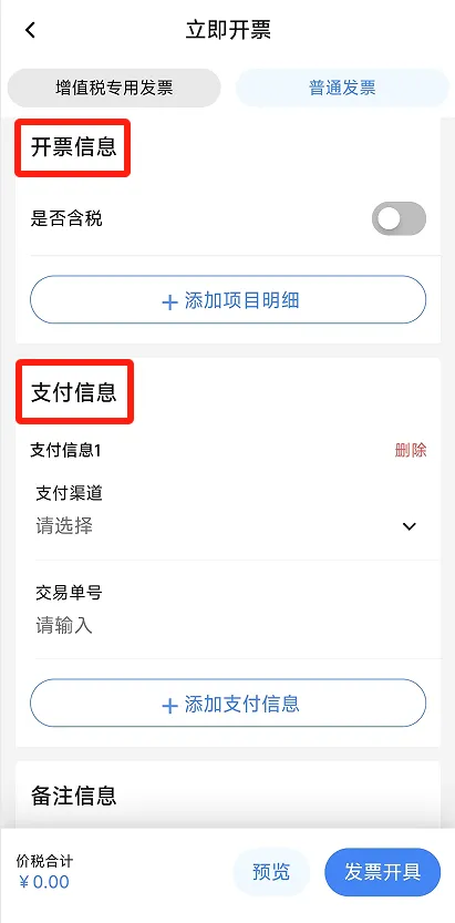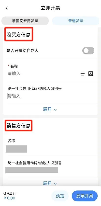 进入蓝字发票开具功能页面,点击【立即开票】选择需要开具的发票类型。在开票页面,根据实际需要填写发票信息(购买方信息、销售方信息、开票信息、支付信息、备注信息、经办人信息等)。