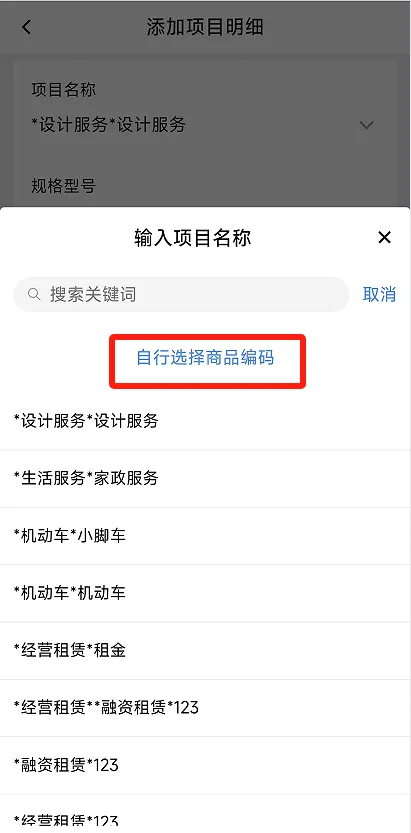 在开票信息位置,点击【添加项目明细】,在跳转后的页面中,输入项目名称,选择已维护的项目信息或系统的推荐选项,并录入单位、数量、金额等项目信息;也可点击【自行选择商品编码】,自行录入商品编码信息。