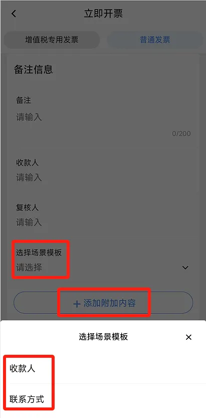 在备注信息位置,可点击【展开】在备注框中填写内容,或者选择场景模板,在带出的附加信息中填写内容;若场景模板中的附加内容还未满足需求,可点击【添加附加内容】,选择已维护的附加信息,也可以手工添加附加信息。