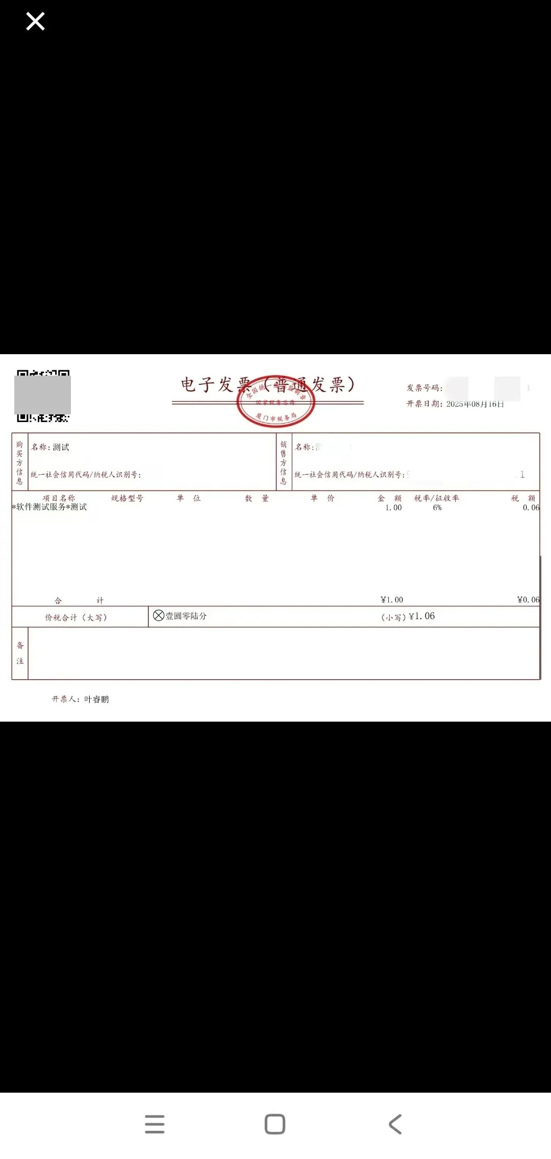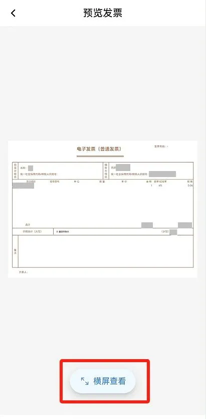 发票信息填写完成后,点击【预览】,可预览正式票样的发票内容,点击【横屏查看】,可以切换为横屏模式。