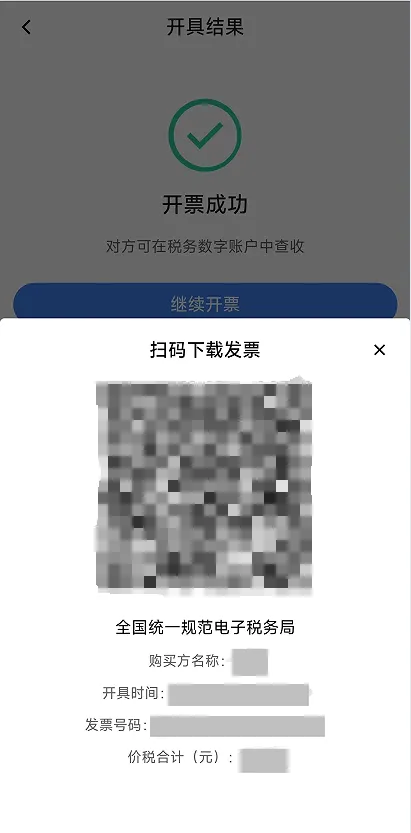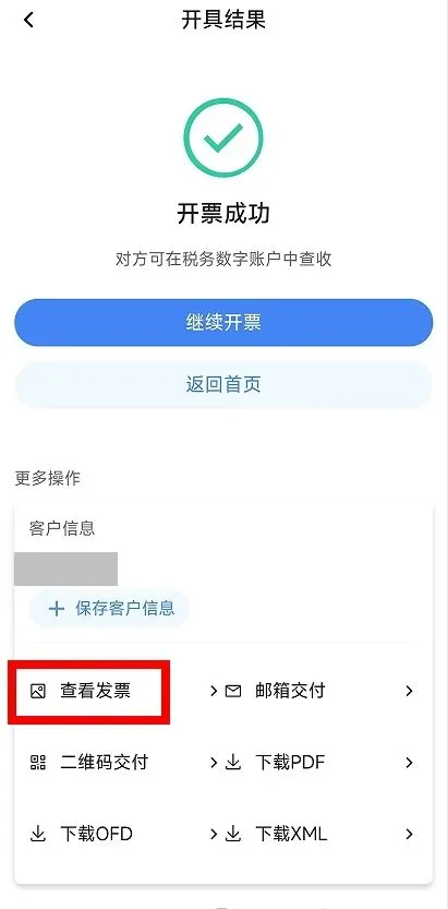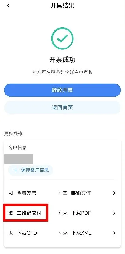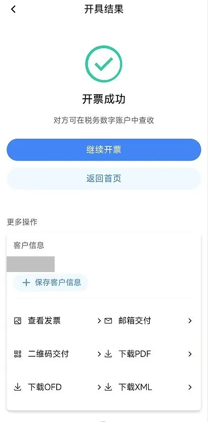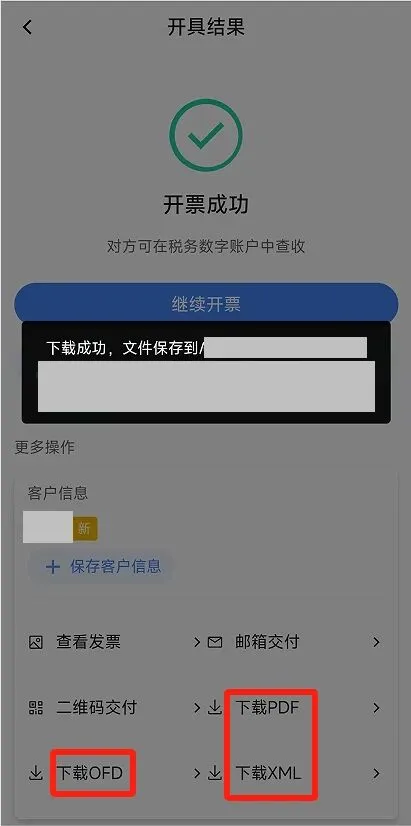 (4)点击【下载PDF】、【下载OFD】或【下载XML】,将发票文件下载到手机,再通过其他方式交付给购买方。