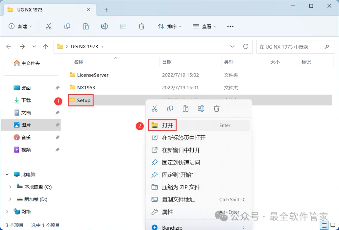 8、回到UG NX 1973文件夹,找到【Setup】文件夹,右键【打开】它