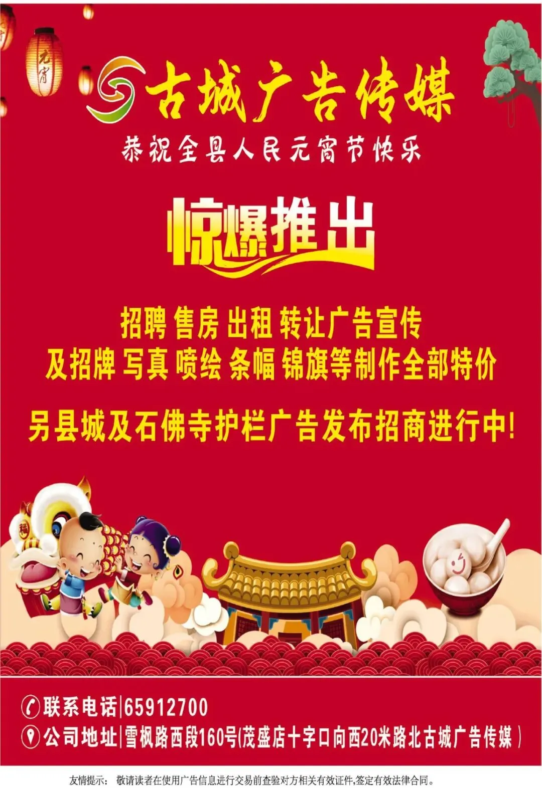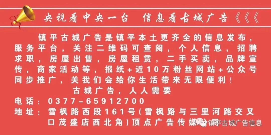 河南古城传媒是你品牌宣传、人才招聘、房屋出售出租、找保姆、找搬家、找钟点工最理想的广告平台!最下方扫码关注公众号,了解更多海量信息