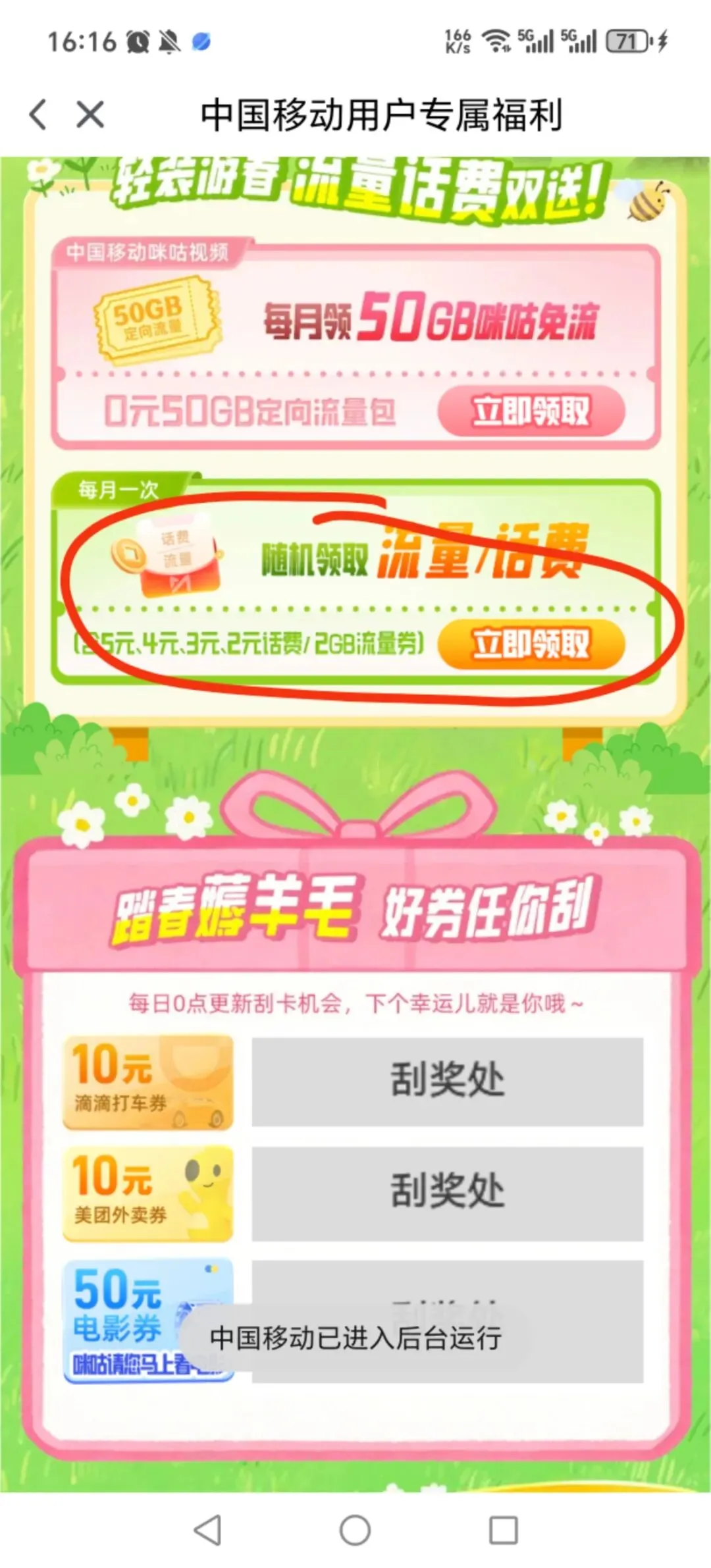 移动新2G(要有咪咕视频app) 前言 流量合集大家先用上个月的吧,月中或者月尾再做个查漏补缺的好了😂 这个2G得有咪咕视频app才能看到活动并且领到流量哈 扫描下方二维码然后点“刮开惊喜”就会跳转到咪咕视频app