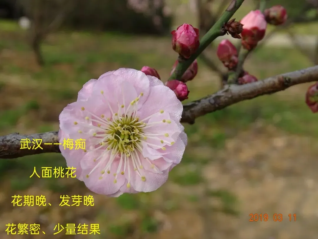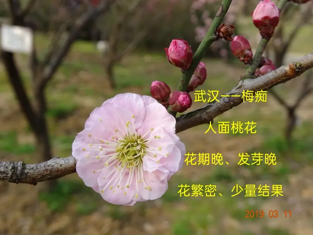 花期:1985年3月14日开10%(武汉), 近年花期为2月下旬至3月上旬(武汉)。