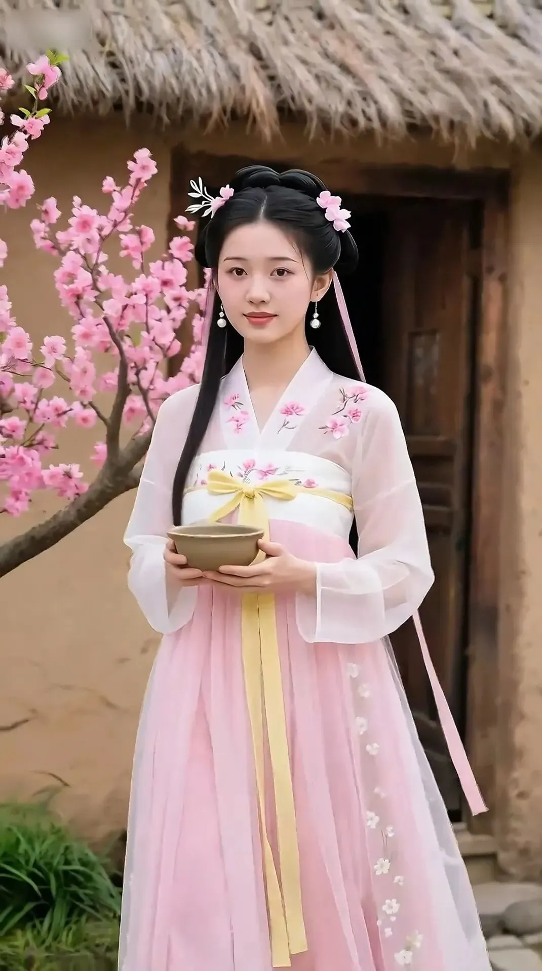 片刻后,一位少女开门,姿容清丽,倚着桃树而立,眉眼间脉脉含情。她取来清水,递与崔护,