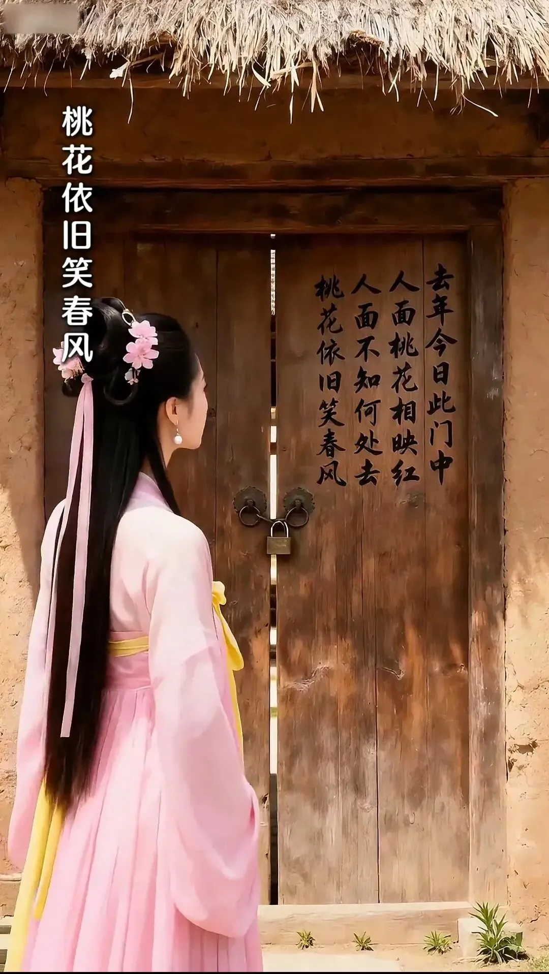直奔城南旧地。门院依旧,桃花灼灼,却已是大门紧锁,不见人影。他怅然若失,便在左门扇上题下那首千古绝句: