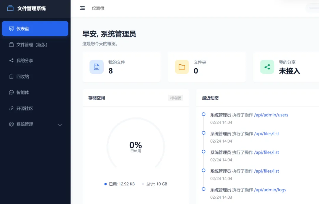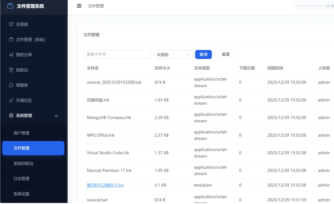 在数字化转型浪潮中,文件管理已成为企业运营的核心痛点之一。传统文件管理方式常面临权限混乱、协作低效、安全风险高等问题,尤其对中小型企业而言,缺乏专业IT团队支持,更需一套低成本、易部署的解决方案。基于此背景,我们推出了一款基于 Spring Boot 3.2.0 + Vue 3.3.x 的现代化企业级文件管理系统,以“安全、高效、易用”为核心,助力企业实现文件管理的智能化升级。