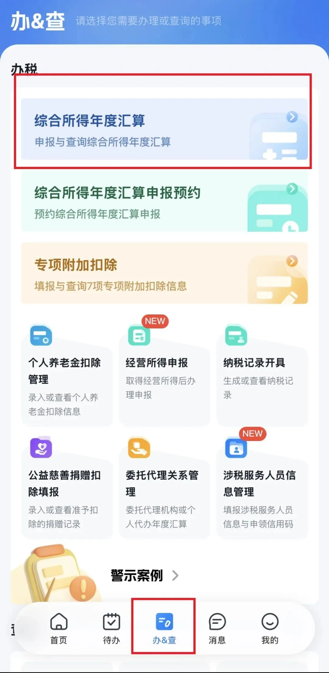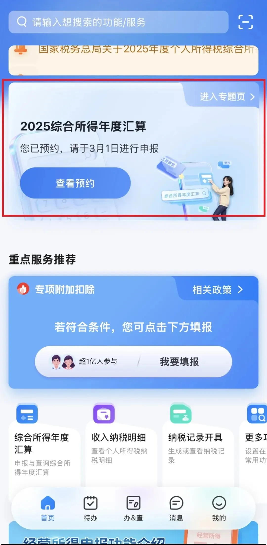 登录个人所得税APP,找到【首页】——【2025综合所得年度汇算】专题——点击【开始申报】,或通过【办&查】——【综合所得年度汇算】发起申报,如下图所示: