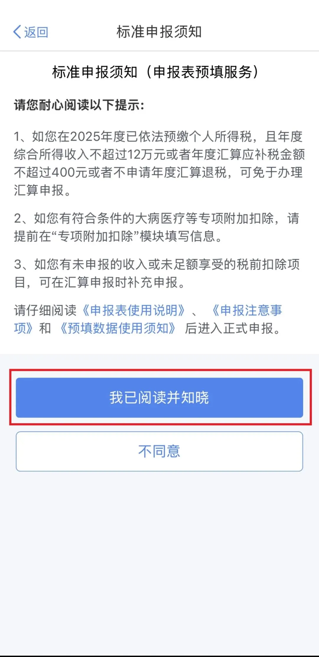 选择申报年度2025年度,阅读并点击【我已阅读并知晓】