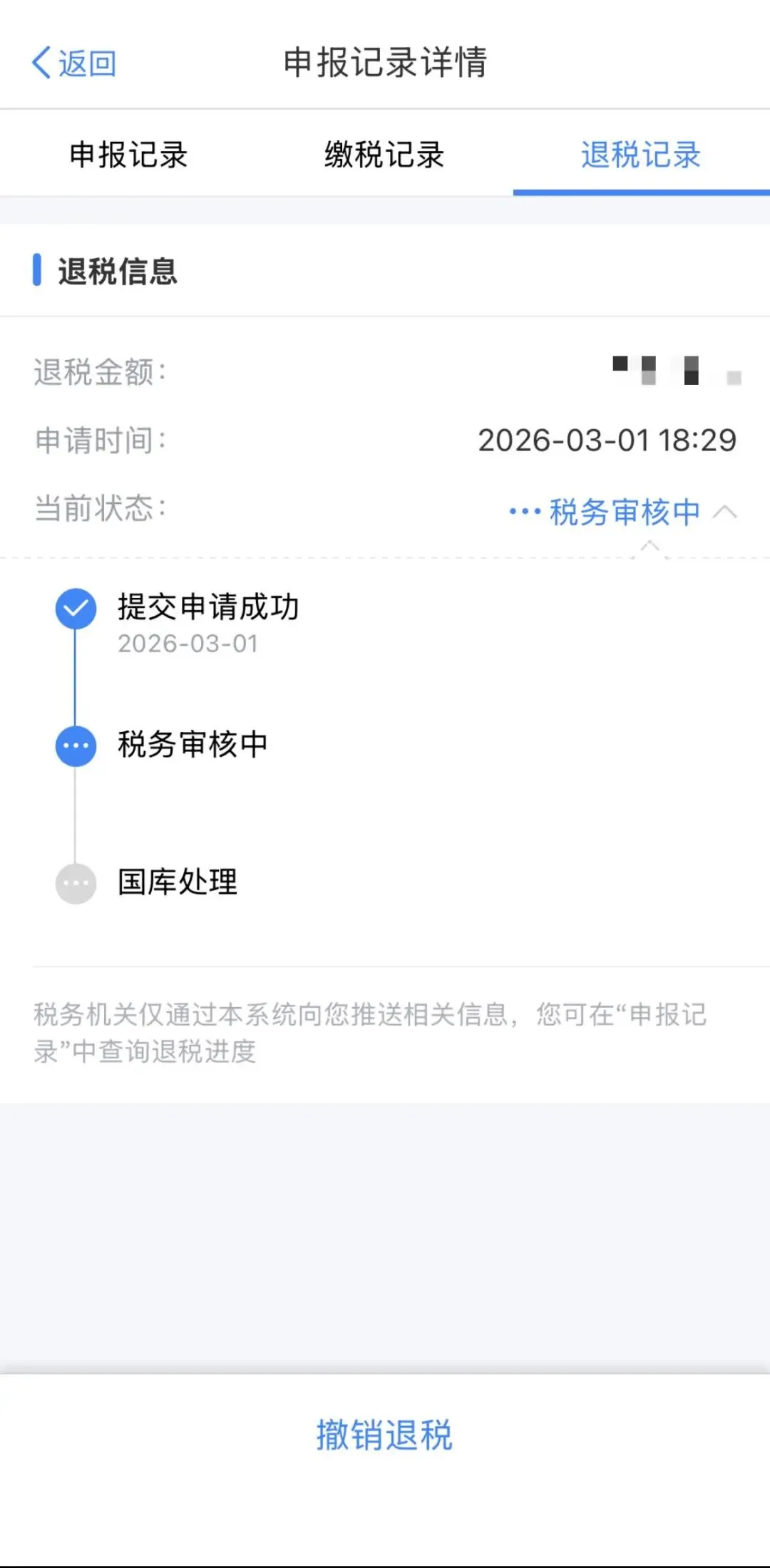 退税需要由税务局专门人员负责审批,过程需要一定的时间,期间请注意关注退税进度。