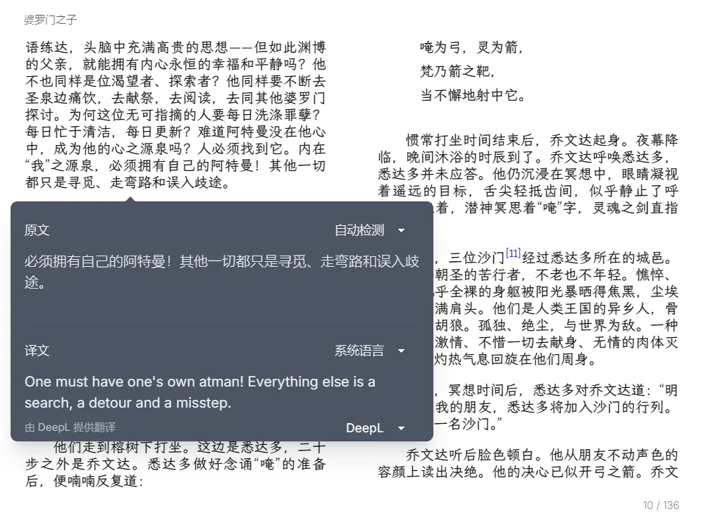 第二,内部集成DeepL翻译引擎,支持全文翻译,方便阅读外文书籍。