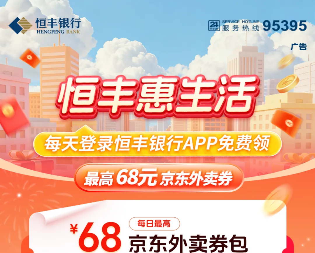 恒丰惠生活丨恒丰银行APP,免费领取最高68元京东外卖券