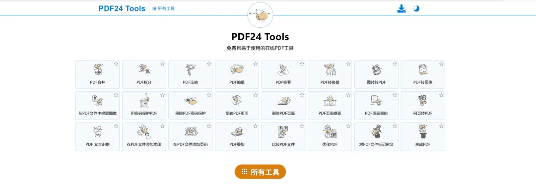 很多人听到“免费”,第一反应是“功能阉割”。但 PDF24 可能会颠覆你的认知。打开它的主界面,你会看到密密麻麻的 30 多个功能图标,这哪里是工具箱,简直是军火库。