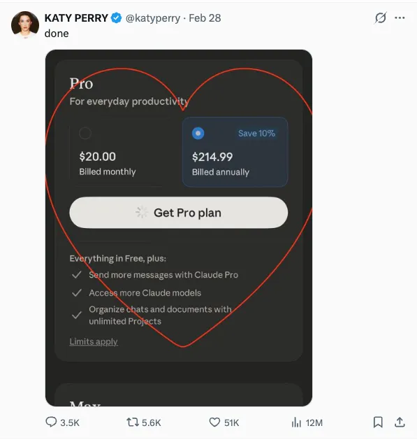 水果姐Katy Perry在X上晒出Claude Pro订阅截图,就贴了个红心,配文”done”。